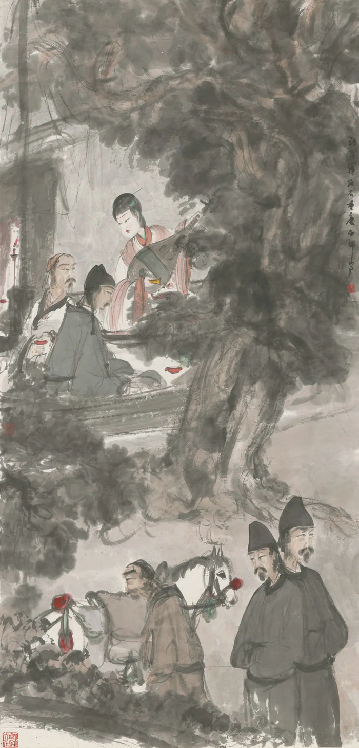 《琵琶行》纸本设色1940年此为傅抱石根据白居易《琵琶行》——“浔阳江头夜送客,枫叶荻花秋瑟瑟。主人下马客在船”“移船相近邀相见,添酒回灯重开宴”“莫辞更坐弹一曲”等诗句进行创作的唐人诗意画作品。主人与客人在倾听琵琶女精彩的演奏,随从与马匹亦静静伫立,专心倾听。画面中巨大的枫树遮蔽了江边,烘托出夜晚皎洁、幽暗的空间。全幅以大写意笔触与细笔结合的形式表现画面人物的精神状态和画面氛围,为傅抱石《琵琶行》诗意题材的精品之作。