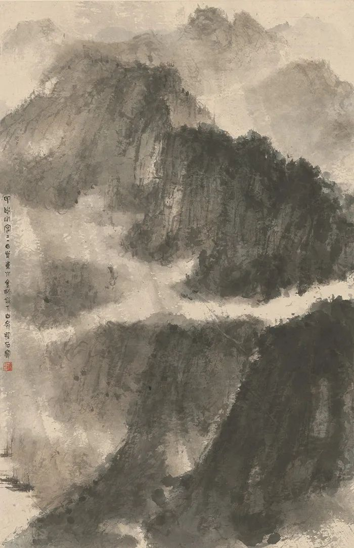 《蜀山图》纸本设色1944年 傅抱石一直比较喜欢诗意画、泉瀑雨境绘画的创作,也往往将二者融汇为一,营造出如梦如幻的优美的画面精神空间氛围。傅抱石此幅作品便是依据唐代诗人李商隐《夜雨寄北》“君问归期未有期,巴山夜雨涨秋池。何当共剪西窗烛,却话巴山夜雨时”中的诗意而创作的唐人诗意画作品,全幅气势雄伟,非常自如地将巴蜀地区多雨雾的奇幻景色与诗人所描述的诗意境象完整地融汇为一体,表达出画家长期客居巴蜀而带来的思乡、旅居的愁思和对时局的彷徨感伤意绪。以画笔作诗笔,不啻为一首典雅优美的“抒情诗”之作。