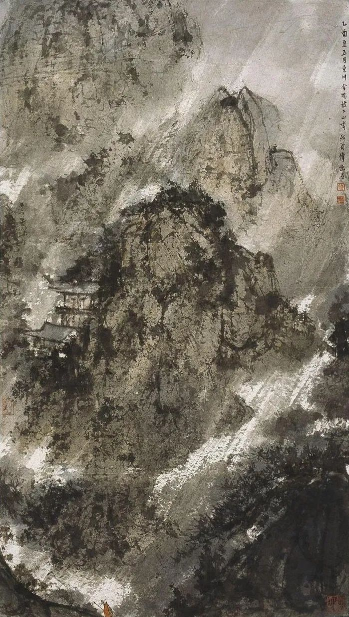 《潇潇暮雨》纸本设色1945年此幅诗意画作品依据明代诗人李东阳《游岳麓寺》“危峰高瞰楚江干,路在羊肠第几盘。万树松杉双径合,四山风雨一僧寒”诗意而创作的诗意画作品,描绘巴蜀雨雾弥漫的奇特景象。山川在烟雨弥漫中静静地沉寂,山阁殿宇微微露出雨帘水气中,山间小路上一持杖红衣人正匆匆低头前行。全幅完整地再现出巴蜀地区多雨条件下特有的山川地貌特色,将古人诗意与雨景创作有机地融汇为一体,亦有着画家本人幽隐而激越的特定精神情怀的表露,高逸冲远,给人以强烈的内心冲击。