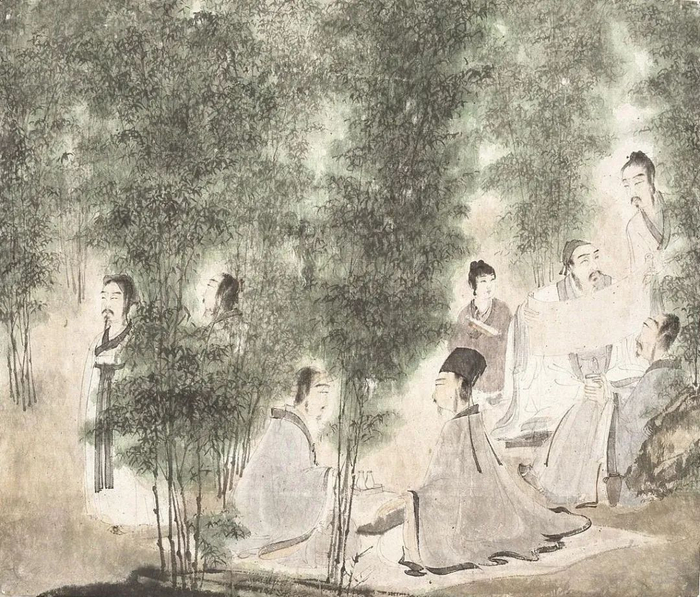 《竹林七贤》纸本设色20世纪50年代这是傅抱石典型的历史故事绘画作品,描绘我国魏晋时期历史人物嵇康、阮籍、向秀、刘伶、阮咸、山涛、王戎的故事。傅抱石非常喜欢“竹林七贤”这一主题,围绕这一主题创作了不少绘画作品,将竹林七贤不同凡响的艺术才华和道德境界在画面中形象地表达出来。竹林七贤作为高逸、放达而具有卓越才华、超越世俗的文人士夫的精神象征,一直成为传统文学艺术的表现对象。此幅《竹林七贤》徘徊于清幽的竹林之间,或品茗饮酒,或徐行远眺、或弹琴,或斟酌文辞,为文士雅集的具体写照,非常逼真地刻画出他们丰富的内心世界,也从中寄托了傅抱石自我的价值理想和精神情怀。竹丛用淡墨、写意笔法勾画,青绿烘染,营造出清幽宁静的画面氛围,衣纹则以细笔勾勒,细劲简雅、洗练畅达,给人以清雅空灵之感。