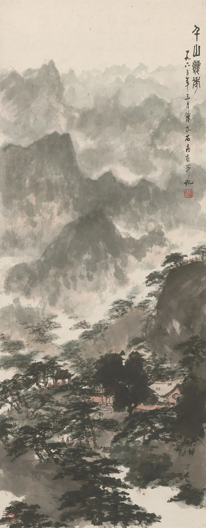《千山竞秀》纸本设色1963年这是傅抱石东北写生的著名作品,是根据记忆和感受在南京创作的东北纪游写生之作,记录下自己对东北山川地貌的印象和情感体验。全幅近景以浓墨、湿笔大胆挥扫,描绘出对千山庙宇、旅游胜地的具体印象,庙宇、林木、游人、溪涧、亭阁似乎都在脑海中浮现出来。中景、远景部分则是对千山万千无际恣肆雄伟、壮阔秀丽的山川物象的综合和记忆,概括出傅抱石自己对东北千山的整体印象,莽莽苍苍而秀丽明洁,不同于南方山水的地貌特色。这是一幅傅抱石通过游、悟、记、写山水画创作手法而创作出来的写生山水作品,亦是对他的山水画创作理论最为成功的诠释。
