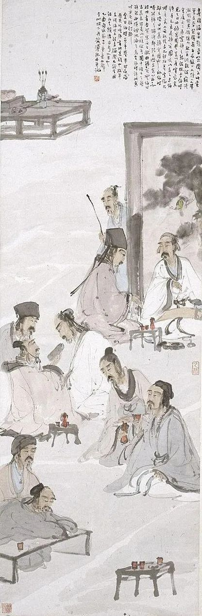 《晋贤图》纸本设色1945年此幅作品为傅抱石创作的具有六朝林下风气的作品,作六朝文人雅集宴居情形,通过对六朝文人日常生活的描绘,寄托自己高远的志向和精神情怀。画作屏风周围几案罗列,有着古衣冠十人,或举杯欲饮,或隐几而卧,或杖策徐行,或侧耳倾听,或捧书诵读,或假寐稍休,或执笔欲书新文,雅集文士的神情意态毕现笔端。同时也将宴饮微醺的意态表现出来,更增添了活泼真实的生活情调。画史记载毛惠远曾作《醉客图》,傅抱石因其意而正名之,在对六朝文人高集雅会的情境描绘中展现出自己对文化生活和精神生活的渴求。全幅借鉴大写意山水的用笔用墨特点,既淋漓尽致,气势奔放,同时注重细笔笔法的微妙结合,线条凝练细劲,于奔放激越中见潇洒秀逸的情致,用笔用墨既放得开,又收得拢,从中可见傅抱石熟练驾驭笔墨技法的能力和过人才情,不愧为傅抱石人物画的得意之作。