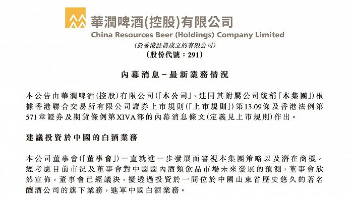 华润啤酒介绍称,景芝白酒将主要从事酿造、分销及推广白酒的业务,预期投资事项完成后,它将成为景芝酒业旗下唯一的白酒业务营运主体。