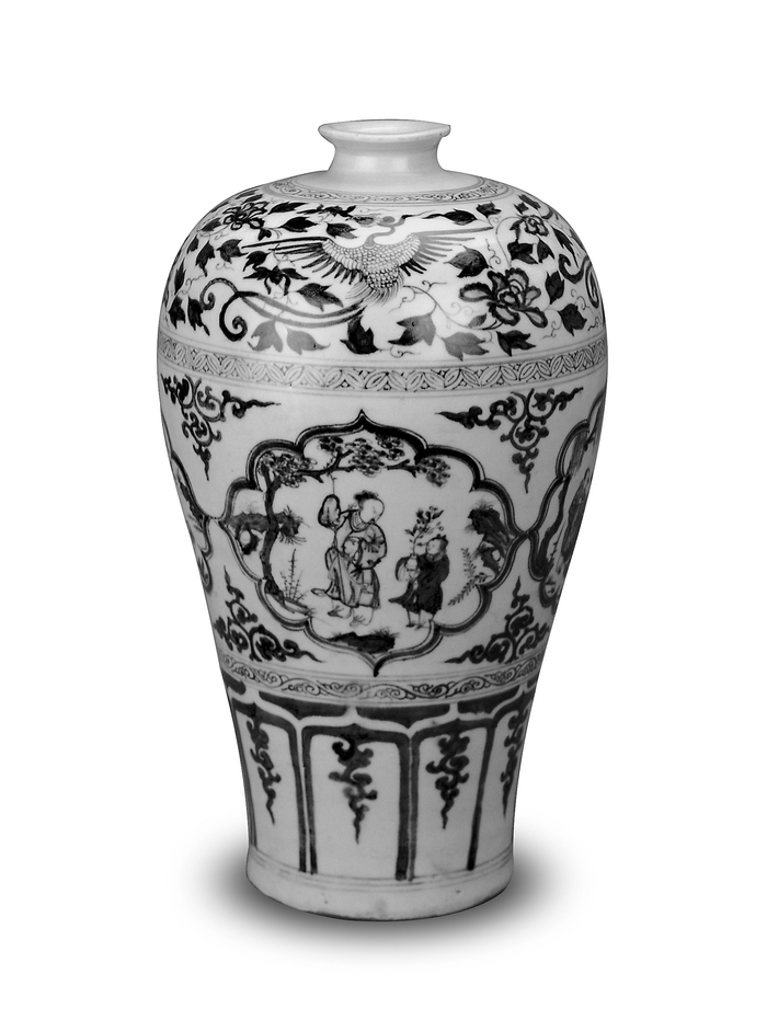 元青花质地优良,画工细腻,题材众多,花卉、走兽、戏剧故事、人物等皆跃然瓷上,漂亮悦目,其制作精美而传世极少,故而异常珍贵。武汉博物馆收藏的这件元青花四爱图梅瓶,通体绘青花纹饰,分三组,肩部饰凤穿牡丹纹。腹部主题纹饰为四个菱形开光,分别绘有古代高士闲情逸致、恬静自然的场景。其素材立意高雅,绘中国古代四位名士著名的爱花故事,即东晋著名书法家王羲之喜爱兰花,兰花为传统寓言纹饰,古人以幽谷兰花喻隐逸之君子;宋代著名理学家周敦颐酷爱莲花,其名篇《爱莲说》通过对莲花形象和品质的描写,歌颂了莲花坚贞的品格,莲花纹饰象征身居高位,廉洁奉公,运用莲与廉同音,有“一品清廉”寓意;人称“梅妻鹤子”的北宋著名诗人林和靖一生未婚,痴爱梅花的高雅和白鹤的飘逸,他隐居杭州西湖,结庐孤山,多植梅树,爱梅成痴,性情高洁;东晋著名诗人陶渊明深爱菊花的傲霜品性,淡泊名利,向往美好的田园生活。腹下部绘仰覆莲纹和忍冬纹一周。该青花陪衬的景物结合主题,四组画面情景交融,造型秀美,线条流畅,色泽浓艳,可谓元代青花瓷中极其罕见的精品。在青花瓷器中,元代青花反映人物图案的器物存世较为稀少,有如此精美的四爱人物图案的元青花梅瓶更为罕见。这件元青花四爱图梅瓶,为了解元代青花瓷制造工艺及人物图案纹饰提供了十分重要的实物资料。