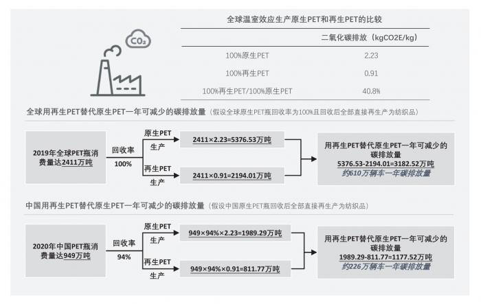 根据美国塑料回收协会(APR),生产1千克原生PET塑料树脂大约需要排放2.23公斤二氧化碳,而生产1千克再生PET塑料树脂只需要排放0.91公斤二氧化碳。以2019年全球PET瓶消费量2411万吨为例,如果理论上可以做到2411万吨PET瓶全部回收,并用于制造再生纺织品,那么相对于使用原生PET树脂生产的纺织品可以减少3183万吨碳排放,相当于610万辆一年的碳排放量。