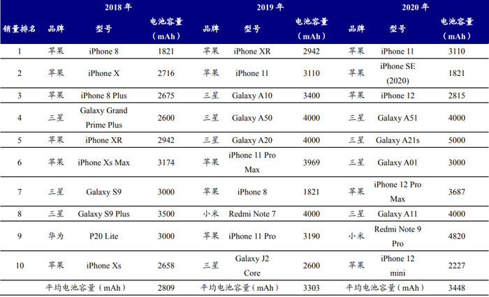 智能手机性能不断优化,单机带电量显著增加。通过对比2018-2020年全球销量前十名机型的平均电池容量,可以发现,智能手机的单机带电量出现了显著的提升,这主要是由于手机性能的不断优化对电池容量提出了更高的要求。同时IDC预计,2021年全球5G智能手机出货量将占全球销量的40%以上,到2025年将增长至69%。5G手机渗透率的提升将进一步倒逼厂商持续优化手机性能,届时智能手机单机带电量也将不断增加。