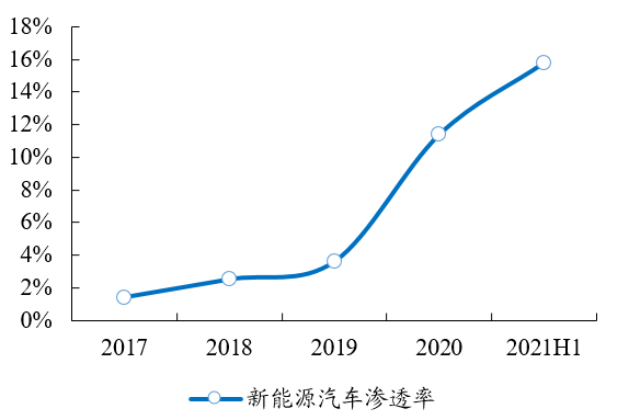 碳排放目标趋严叠加政策优惠,推动欧洲新能源汽车快速放量。在相关政策刺激之下,欧洲新能源汽车销量实现了迅速增长。根据ACEA数据,2020年欧盟+ EFTA +英国全年销量合计达到136.5万辆,同比增长达到142%,2021H1销量达到102.9万辆,同比增长157%。同时在渗透率方面,2021年H1欧盟+ EFTA +英国的新能源汽车市场渗透率已经达到15.8%,未来随着新能源汽车的加速放量,渗透率有望持续提升。
