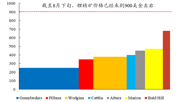 根据我们的统计,目前西澳在产矿山中除了Greenbushes的现金成本低于300美金以外,其余矿山的锂精矿现金成本均集中在350-500美金区间范围内。此外,需要注意的是,待复产矿山Bald Hill的现金成本已经达到680美金/吨,在当前锂精矿供不应求的局面下,假设该矿山开始复产,则以其锂精矿作为原材料生产碳酸锂的完全成本(除锂精矿现金成本以外,还包括锂精矿的非付现成本、运费等以及碳酸锂的加工成本与四费)已经接近7万元/吨。在此背景下,碳酸锂的底部价格也接近8万元/吨(底部价格由最高的完全成本加上增值税所决定,碳酸锂价格至少不会低于这一水平)。当然8万元只是底部价格,目前最新电池级碳酸锂市场报价已经逾10万元,在2023年之前锂盐刚性缺口难以弥补,长时间的供不应求容易导致价格持续飙涨,甚至冲击前期16万元的历史高位水平。
