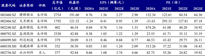 注:1、除永兴材料以外,其余公司盈利预测与估值均来自Wind一致预期;2、盈利预测与估值数据以2021年8月24日收盘价为基础。