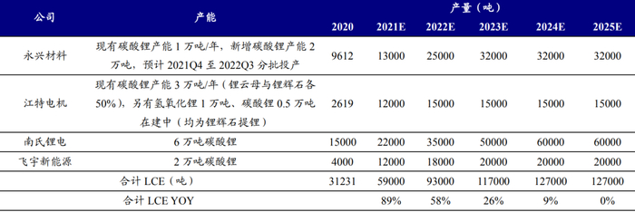 注:1、南氏锂电与飞宇新能源2020年产量为预测数据;2、永兴材料2020年产量包括试生产期间的1481吨;3、江特电机的碳酸锂产量仅为云母提锂的产量,不包括锂辉石提锂的产量。