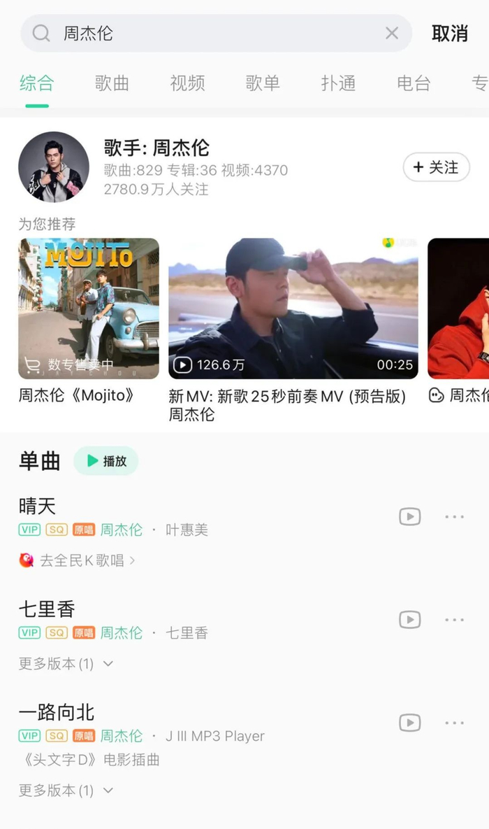 除此以外,周杰伦的部分歌曲需要充值会员(绿钻)才能收听。