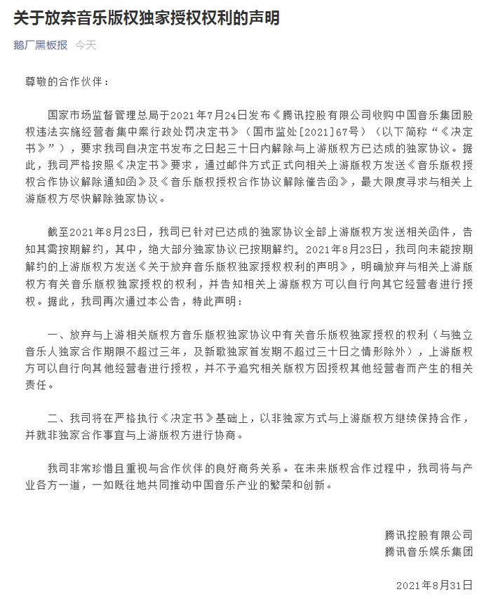 8月31日晚,腾讯通过其官方微信公众号发布“关于放弃音乐版权独家授权权利的声明”,表示已最大限度寻求与相关上游版权方尽快解除独家协议。