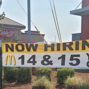 财联社(上海,编辑 潇湘)讯,近几个月来,“用工荒”已成为了越来越多美国企业所面临的严峻考验,许多公司都在想尽办法提高待遇,以吸引应聘者。而据当地媒体报道,在美国俄勒冈州梅德福市(Medford)的一家麦当劳分店,由于人手紧缺,该店已在门店前张贴出显眼的横幅,鼓励14-15岁的未成年人前来应聘。