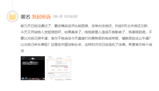 据该用户反映,由于最近经济比较困难,没有办法偿还,约定9月之内偿还欠款。但当日却收到相关催收短信,短信内容显示:“今天下午3点外访人员告知你父母全款结清,外访部即将抵达本地。”同时,该短信内容还说明了外访人员车牌号以及要全程摄像的情况。