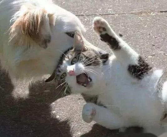 但是,猫狗打架如果要认真的话,猫一般都会输掉然后逃跑,跑都跑不掉的就会被狗咬死。对于金毛、哈士奇等常年被人物圈卷的大型宠物狗,基本被训练成较为温顺的大型犬种,没有主人的命令,一般情况下不会发狂到直接去攻击猫咪。但是对于中华田园犬等本地犬种,这才是猫咪们天生的死敌,它们的骨子里可没有猫尊狗卑的思想。在各种品种的狗引进来之前,中华田园犬到处都是,而且都是用来看家护院的。而遇到入侵者猫咪自然是往死里追,往死里整的份。而且犬类打架是群殴,而流浪猫喜欢单打独斗,正常体型下一只猫面对一只狗也不一定能打得过,更何况是面对一群。