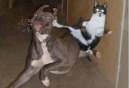 所以,猫狗大战,在家庭里狗忍受猫的欺负,是顾全大局的智慧;在外边狗咬死猫,是自然法则的体现;如果是同体型且一对一的情况下,狗一点胜算都没有。