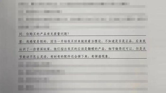 让王先生没想到的是,一次线下交流活动中,奥特曼资深玩家看了王先生的收藏,十分专业地指出了油漆颜色偏差、关节连接处粗糙等多处疑点,认为明显是假货。气愤的王先生投诉至权利人万代公司。