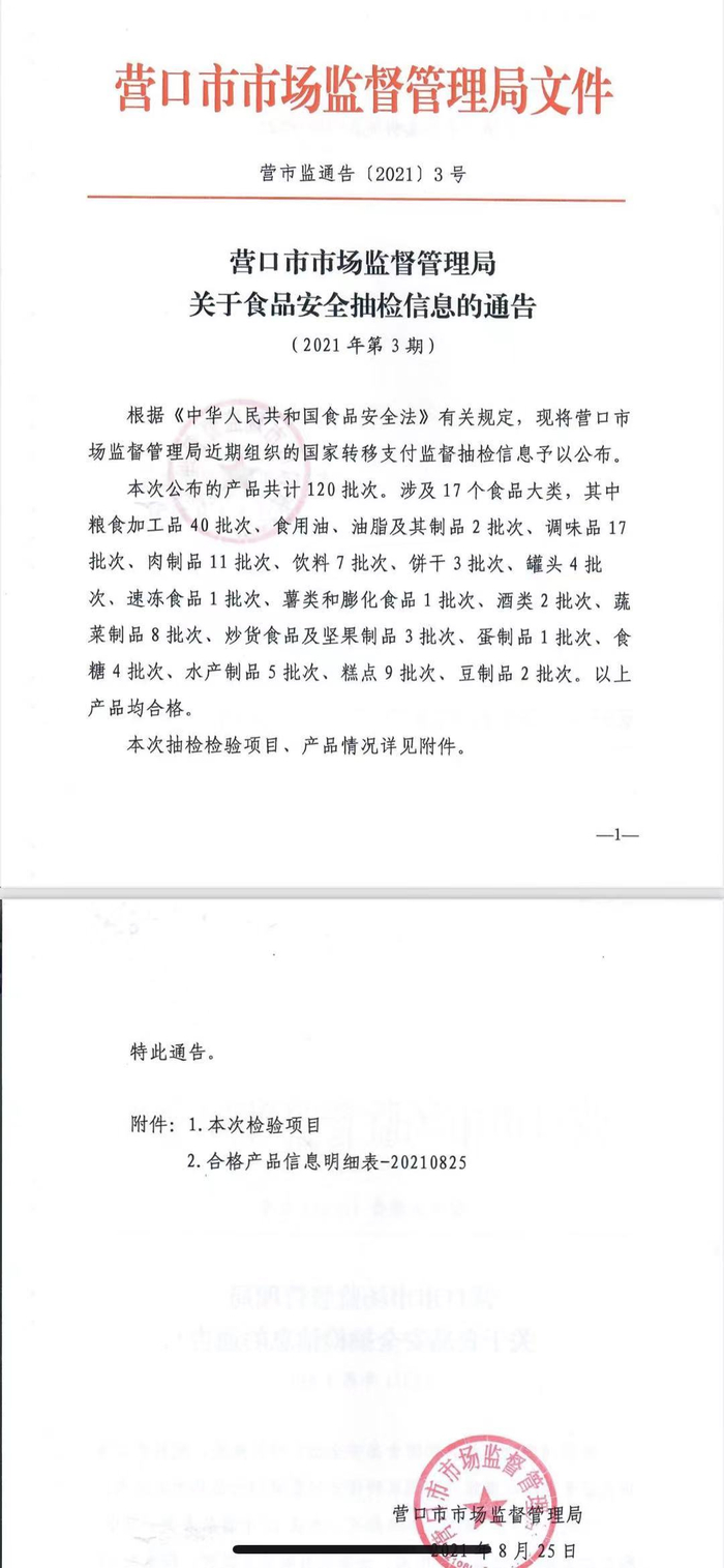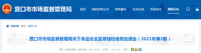 原标题:辽宁省营口市市场监管局发布2021年第3期食品安全监督抽检信息