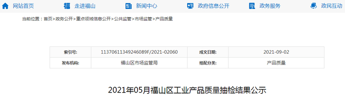 中国质量新闻网讯 2021年9月2日,山东烟台福山区人民政府网站刊登2021年05月福山区工业产品质量抽检结果公示。