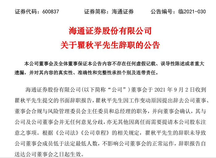 今日晚间,海通证券发布公告称,董事会于2021年9月2日收到瞿秋平先生提交的书面辞职报告,瞿秋平先生因工作变动原因提出辞去公司董事、董事会合规与风险管理委员会主任委员和总经理的职务。海通证券董事会对瞿秋平先生为公司发展所做的卓越贡献表示诚挚敬意和衷心感谢。