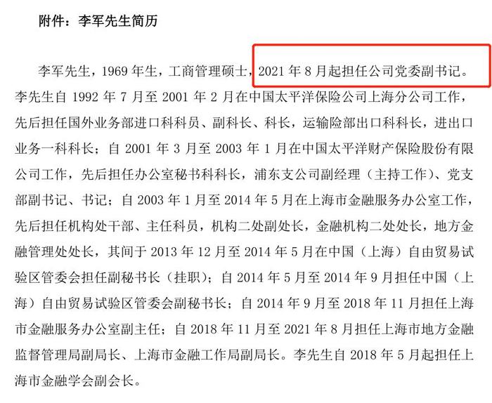 此外,在今日海通证券公布的李军详细简历中,已显示其2021年8月起担任海通证券党委副书记。