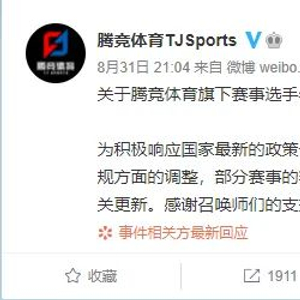 8月31日晚,腾竞体育官方微博发布了“关于腾竞体育旗下赛事选手年龄合规调整的公告”。腾竞体育表示,为积极响应国家最新的政策号召,腾竞体育主办的所有赛事都在进行选手年龄合规方面的调整,部分赛事的赛程可能涉及调整。