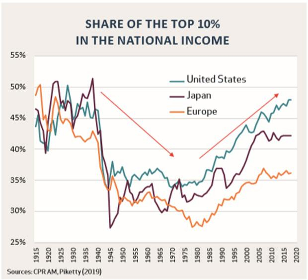 10%最富有人群收入占国民总收入的比例,皮凯蒂(2019)