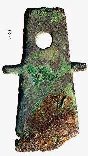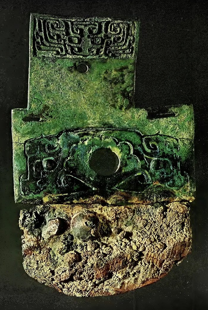 虽然我们不知道这个圣域的形成是否与陨石相关,但是阿尔泰社会是春秋早期周秦社会金器和铁器的重要来源。在关中东端,踞守关中东北角韩城与澄城的芮国、三门峡的虢国以及晋南的晋国成为抵挡戎人东进的重要势力。这些与戎为邻的周人贵族墓中频繁出现金器,以及金柄和玉柄铁剑。虢国扼守崤函古道和黄河茅津渡口。上村岭墓地春秋早期虢国墓地出土国君、夫人与太子等高级贵族墓葬。其中,虢季墓M2001出土的玉柄铜芯绿松石镶嵌铁剑是中原最早的人工冶铁制品,虢仲墓M2009发现的三件铁刃铜兵器和工具则都是陨铁做刃。其中两墓分别出土的两件绿松石镶嵌兽口吐刃铁援铜戈,造型完全相同,然而一件使用陨铁,一件使用人工铁,说明当时两种来历不同的铁器可以互相替代。虢国墓地中陨铁与人工冶铁制品并存,要求我们用一种来自陨铁应用传统的视角来观察中国铁器时代的发端。虢国墓地出土金饰与仿金铜马甲的造型特征,都与戎族和阿尔泰社会密切相关。