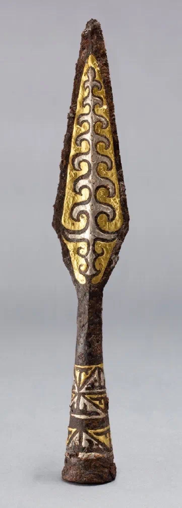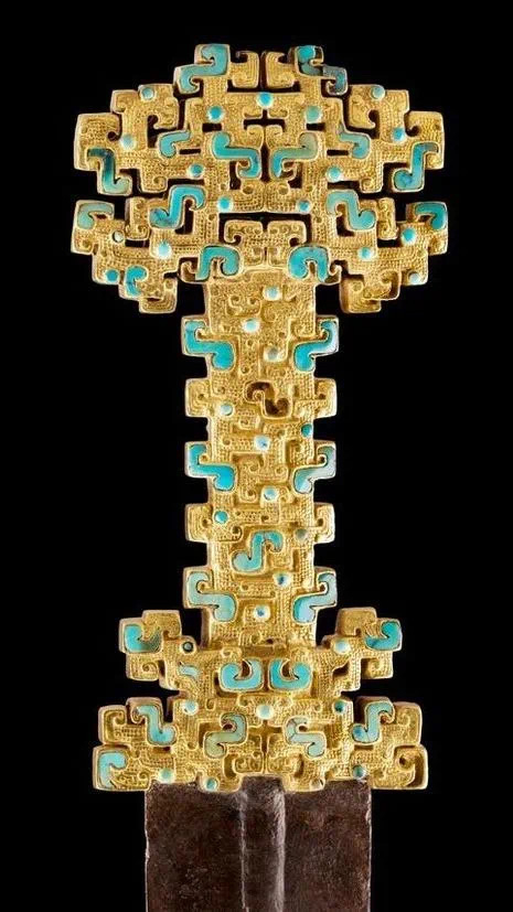 虽然万里只在倏忽之间,古人的天幕中没有随机划过的流星——所坠之处,山川、宇宙、历史之间发生独特而复杂的关联,打破天文与地矿之间的界限。中商到周初遗址中发现的陨铁兵器如此之少,铸造时间如此之集中,它们可能来自中商到殷墟早期南北交流中输入的一批或几批陨铁原料。《尚书 ·禹贡》描述的梁州贡物也曾指向一个铁制品曾经稀少的时代:“华阳、黑水惟梁州。厥贡璆、铁、银、镂、砮、磬,熊、罴、狐、狸、织皮。”韩城梁带村芮国墓地铁刃铜器、灵台景家庄铜柄铁剑、宝鸡益门村二号墓绿松石镶嵌金柄铁剑、陕县后川金镡金首铁剑共同显示,春秋时代早期人工铁器的发现集中在关中周边。从陨铁到块炼铁的转折过程中,黄金与铁的紧密结合反复指向阿尔泰山脉冶金工业。随着中原人工冶铁技术的成熟,战国、秦汉社会广泛地用铁制作工具与武器,陨铁渐渐失去了其流星的光泽。然而,战国晚期马家原戎人墓地出土的错金银铁兵器,依然保存着来自黄金与陨铁时代的美学传统。