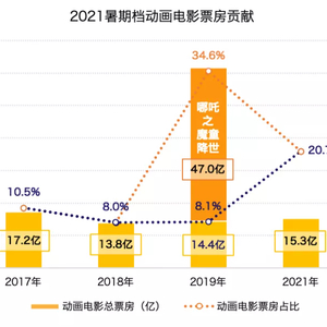 横向比较来看,虽然暑期档73.78亿的总票房远不及预期,但是动画电影发挥稳健。相对2018年、2019年的22部,今年暑期档上映动画电影数量小幅提升。如果去掉2019年的超级爆款《哪吒之魔童降世》,2021年暑期档动画电影产生的票房与2018年(13.8亿)和2019年(14.4亿)基本持平。