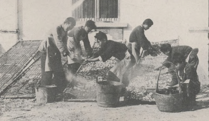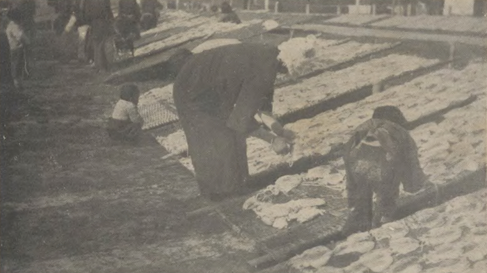 以黄鱼鲞为例。1933年,一份水产加工实习留下了珍贵的“制鲞工艺录”。做黄鱼鲞的第一步,雅称“三刀头”,往细里说,是在制鲞者坐在长板凳上,另一头用线拉出方形框,把鱼头朝人,背鳍向右嵌入框内固定,随后划“三刀”:第一刀,从背侧头后划至尾部,要做到“深可通腹”。随后,制鲞者要顺势把鱼身翻个面,紧接着沿“胸鳍后臀鳍前,自背至腹”这条线,补上第二、第三刀。接下来,制鲞者要借着手腕巧劲完好无损地抽出黄鱼胶,随后通过刀孔,将食盐塞入鱼体,再把大量盐均匀地涂抹在鱼身表面。盐渍好的黄鱼会堆叠在盐桶内并压以重石,就像腌雪里蕻咸菜一样。三四日过后,就要进入干燥环节,晴日下的晒场铺满席篾或稻草,制鲞者把盐腌过的黄鱼整齐排开,同时顺手将朝上的鱼鳃揭开,隔半天翻个面。如此暴晒三四日后,黄鱼鲞才算大功告成。