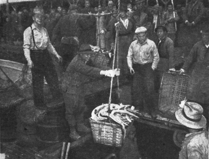 除常规渔船外,近代东海洋面上还航行着为数不少的“特种渔船”。譬如对乌贼、海蟹等“喜光”水产,渔民会在夜间驾驶“烧火船”吸引目标“见光麕集”,见机下网。那时舟山群岛的渔获主要是大黄鱼、鲳鱼、鳓鱼、螃蟹,所有海产都有直接对接上海、宁波城市市场的专门渠道:“渔船归港,即售予冰鲜船转销沪甬”。