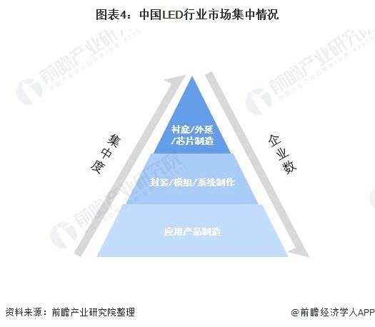 总体来看,LED产业链各环节参与企业数量与市场集中情况呈金字塔型分布。上游衬底制作、外延生长和芯片制造具有技术和资本密集的特点,参与竞争的企业数量相对较少,企业资源比较集中;中游LED封装环节具有技术与劳动密集型特点,参与企业数量较多,近年来LED封装行业由于产能扩张经历了价格战后,部分中小厂商被淘汰,行业集中度逐渐提高;下游应用的进入门槛相对较低,劳动密集的特点更为突出,参与其中的企业数量最多,行业集中度较低,竞争激烈。