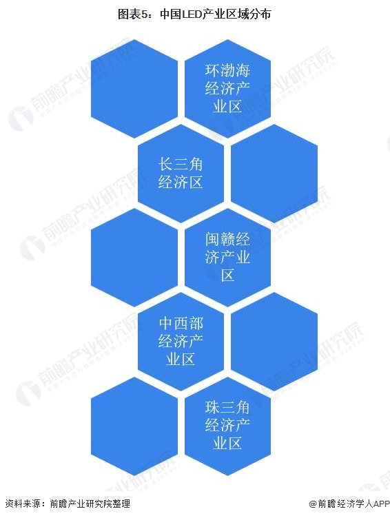 中国的LED产业可以划分为长三角经济区,环渤海经济产业区,珠三角经济产业区,闽赣经济产业区和中西部经济产业区五大主要经济产业区。从区域分布情况来看,珠三角和长三角是国内LED产业最为集中的地区,上中下游产业链比较完整,集中了全国80%以上的相关企业,也是国内LED产业发展最快的区域,产业综合优势比较明显,与LED有关的设备及原材料供应商纷纷在这两个区域落户。