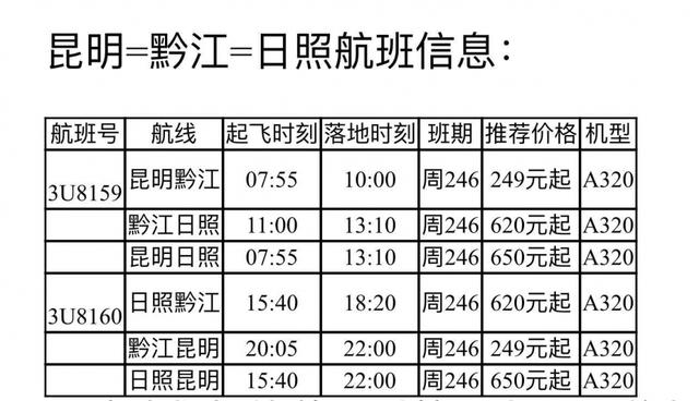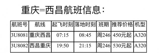 9月4日,记者从四川航空公司获悉,从9月9日起,新开重庆=西昌航线,航班号3U8081/2,执行周期246,单程票价450元起。9月16日起,新开昆明=黔江=日照经停航线,航班号3U8159/60,执行周期246,单程票价249元起。