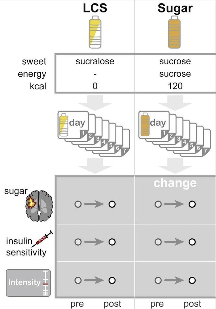在这项研究中的其中两组:一组所喝的饮料加入的是蔗糖(平常用的方糖);一组饮料中加入的是同等甜度的三氯蔗糖(一种代糖),每人在两周时间内需要喝掉7瓶饮料。