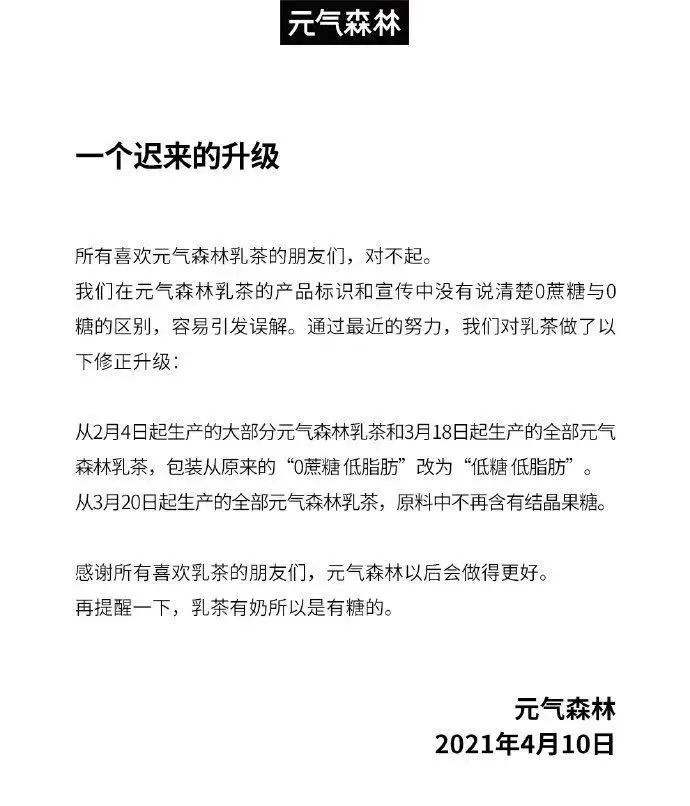 在这份声明中,元气森林明确表示旗下的乳茶系列因为有奶所以是含糖的,并不是瓶身上所标注的"0蔗糖"。