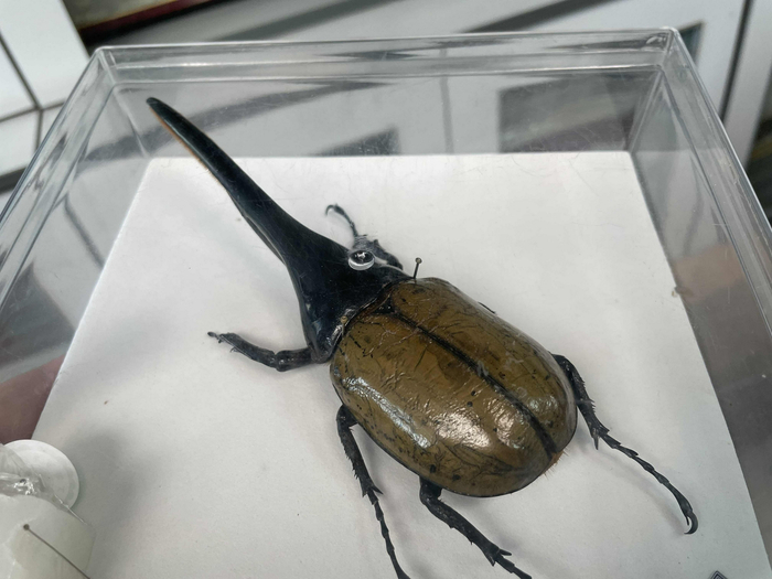 桌上另一边,一只长戟大兜虫仍保持着生前雄赳赳气昂昂的模样。