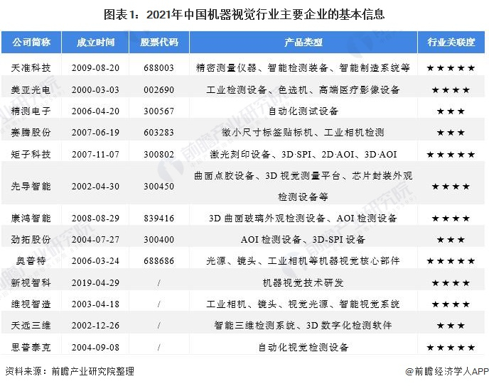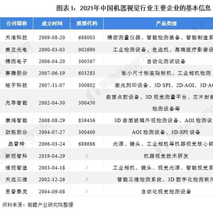 机器视觉行业主要上市公司:目前国内机器视觉行业的上市公司主要有天准科技(688003)、美亚光电(002690)、精测电子(300567)、赛腾股份(603283)、矩子科技(300802)、先导智能(300450)、康鸿智能(839416)、劲拓股份(300400)等。