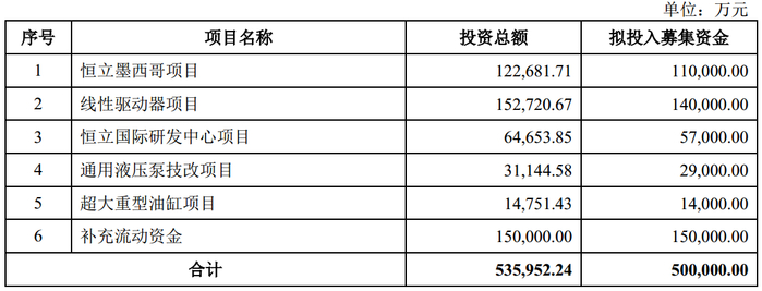 具体看来,恒立液压此次定增募集资金将主要用于恒立墨西哥项目(11亿元)、线性驱动器项目(14亿元)、恒立国际研发中心项目(5.7亿元)、通用液压泵技改项目(2.9亿元)、超大重型油缸项目(1.4亿元)以及补充流动资金(15亿元)。