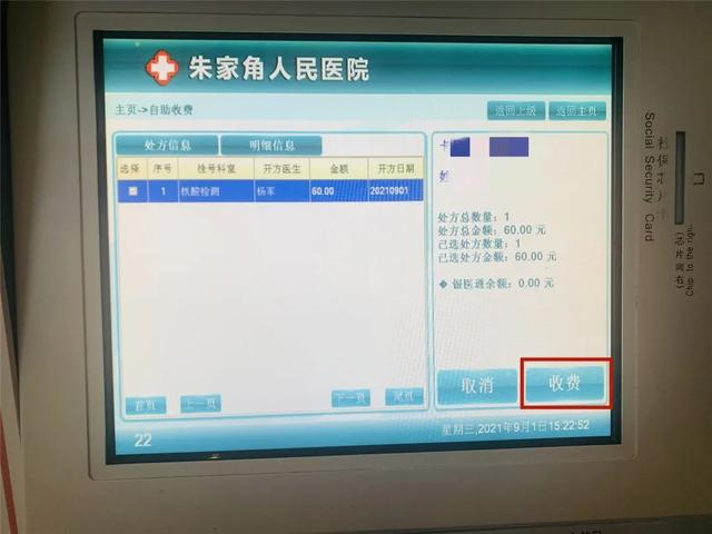 收费完成后,拿好自费卡/医保卡、自助挂号费用凭单和自助收费费用凭单至核酸采集点进行样本采集。(采集前请先在健康云进行个人检测登记)