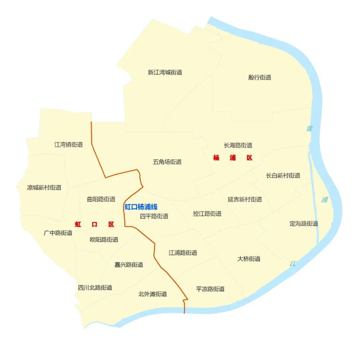 沿线涉及虹口区的江湾镇街道、曲阳路街道、欧阳路街道、嘉兴路街道、北外滩街道和杨浦区的五角场街道、四平路街道、江浦路街道、平凉路街道。