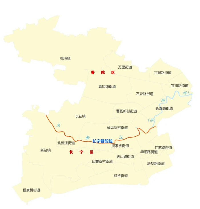 沿线涉及长宁区的新泾镇、北新泾街道、周家桥街道、华阳路街道和普陀区的长征镇、长风新村街道、长寿路街道。