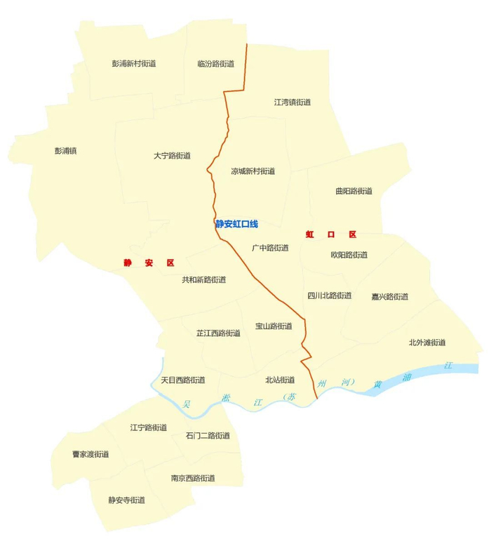 沿线涉及静安区的临汾路街道、大宁路街道、共和新路街道、宝山路街道、北站街道和虹口区的江湾镇街道、凉城新村街道、广中路街道、四川北路街道、北外滩街道。