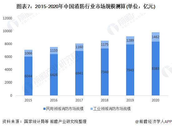 从工业领域来看,一般工业领域消防投入占行业固定资产投资支出的比例在3%左右,前瞻结合工业领域固定资产投资额测算,2020年中国工业领域消防市场规模约为1462亿元。