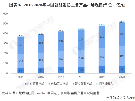 前瞻结合慧聪消防网公布的各消防子细分市场/产品在消防行业中的占比,以及前文测算消防行业市场规模,测算2020年火灾报警产品市场规模约为79亿元,自动灭火产品市场规模约为197亿元,智能疏散产品市场规模约为236亿元。综上,2020年,智慧消防主要产品市场规模达到528亿元。