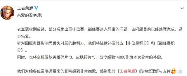 针对因服务器影响而丢失对局的胜利方,王者荣耀表示,将陆续补发对应【排位星积分】和【巅峰赛积分】,同时,也将全服发放英雄碎片 * 3,皮肤碎片 * 3,战令经验 * 4000作为本次异常的补偿。