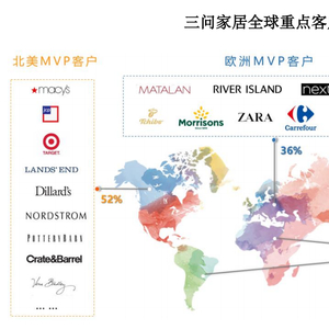 三问家居则是以原创设计为核心竞争力的服务型贸易商,定位为“做全球客户与供应商最有价值合作伙伴”,为全球中大型零售商和中高端品牌商提供特色家用纺织品、家居服饰和特色面料产品,具体包括客厅场景的靠垫、毯子、披巾,卧室场景的床品、浴袍、睡衣,以及家居休闲服、运动休闲服、配饰等。其客户遍及美国、英国、瑞典、澳大利亚、南非、日本、韩国等30多个国家和地区,为Target,Matalan,Nordstrom,Barefoot Dreams,Vera Bradley等全球超过190家中大型零售商和中高端品牌商客户提供相关产品。