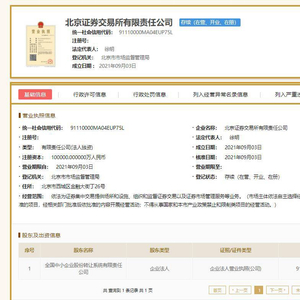 9月5日,封面新闻记者从国家企业信用信息公示系统网站获悉,北京证券交易所有限责任公司于9月3日注册成立,注册资本金10亿元,登记机关为北京市市场监督管理局,经营范围为:依法为证券集中交易提供场所和设施、组织和监督证券交易以及证券市场管理服务业务。