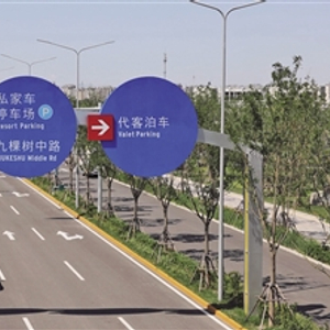 8月27日,北京环球度假区,停车场周边道路设有交通指示牌。新京报记者 郭延冰 摄